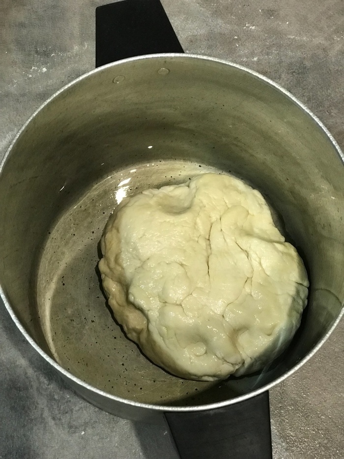 Вымесите тесто на присыпанной мукой поверхности в течение 5-7 минут, пока оно не станет эластичным. Поместите тесто в смазанную маслом миску, накройте полотенцем и оставьте подниматься в тёплом месте на 1-1,5 часа, пока оно не увеличится вдвое.
