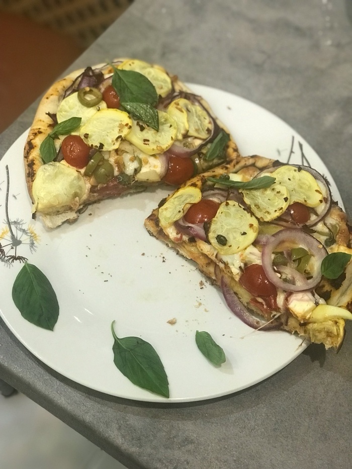 Равномерно распределите ломтики моцареллы по всей поверхности пиццы. Затем добавьте фету, оливки, артишоки, помидоры черри, красный лук, цукини и каперсы.