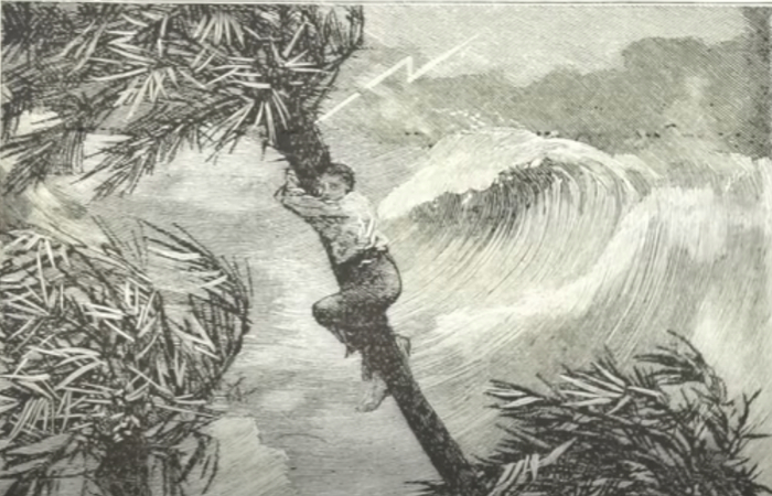 После этой катастрофы, в разрушенном городе всё затихло, но уцелевшие люди с удивлением отметили, что морская вода отступает от берегов. Такого они ещё не видели и не были готовы к накатившему цунами. Волна была двухметровой. Хах, чё тут страшного, скажете вы. Но это была стена воды, которая шла со скоростью автомобиля. Поэтому она смыла с острова всё что плохо лежало, разгромила всё, что после землятресения плохо стояло, перевернула и затопила корабли, а один корабль протащила по улицам и воткнула в здание в середине острова.