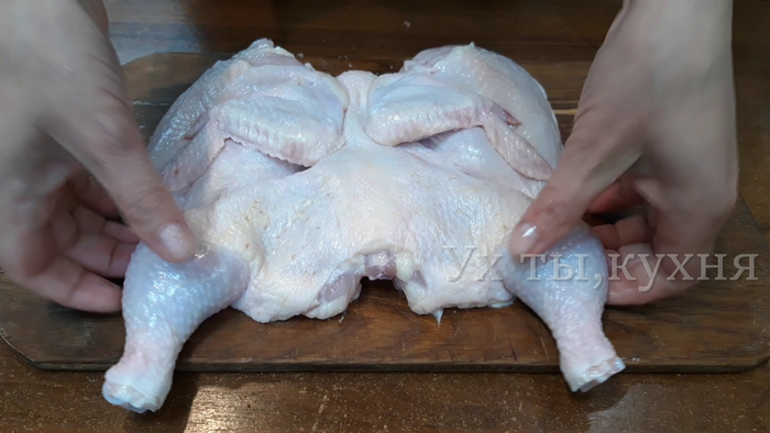 Разрезаем вдоль по грудке. С помощью молотка для отбивания мяса (плоской стороной) проходимся сверху по всей тушке, перебиваем суставы. Нам нужно, чтобы цыпленок стал плоским и при этом не повредить кожу.