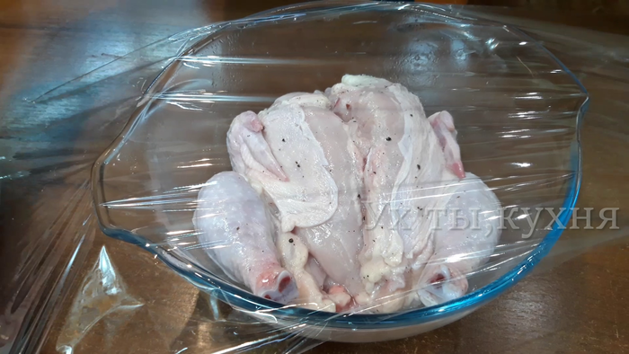 Тушку смазала со всех сторон маринадом. Накрыла пищевой пленкой и отправила в холодильник на ночь.