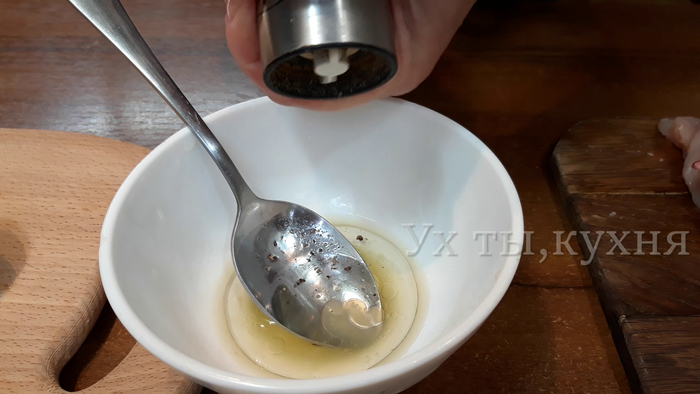 Готовим маринад. Я использую сок лимона, растительное масло и свеже - молотый черный перец. Всё соединила и перемешала.