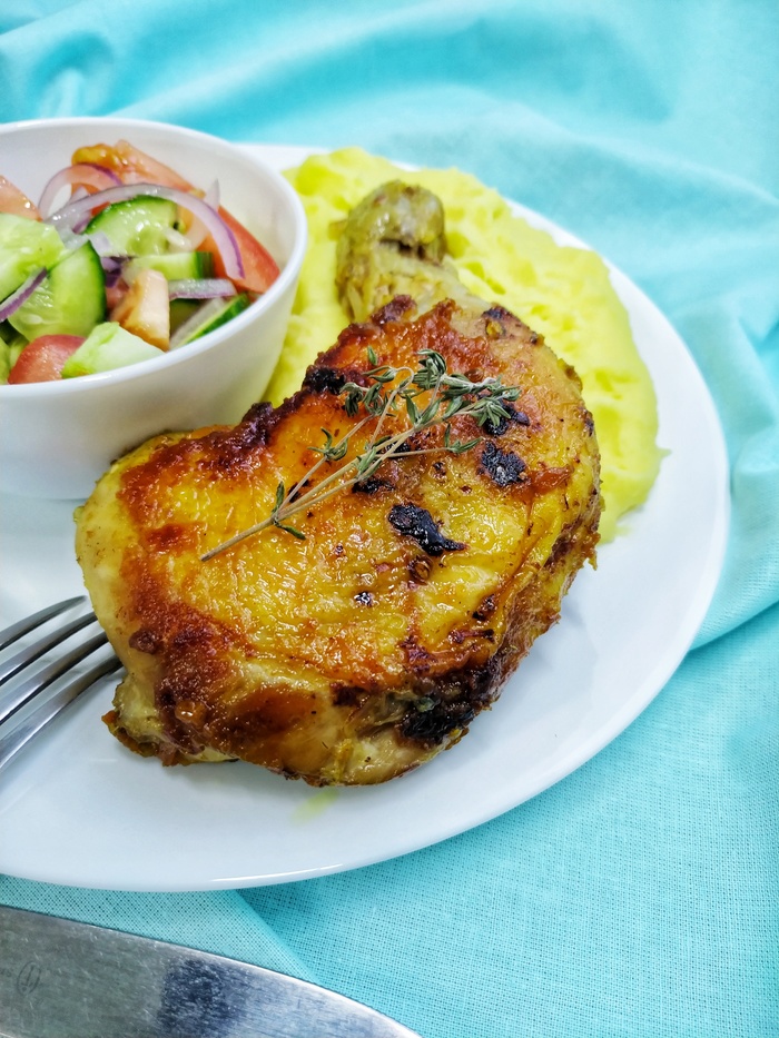 3. Разогреваем сковороду со смесью масел на среднем огне и кладем цыпленка кожей вниз. Прижимаем чем-нибудь тяжелым (я использовала кастрюлю с водой, например) и жарим по 7-10 минут с каждой стороны до хрустящей корочки