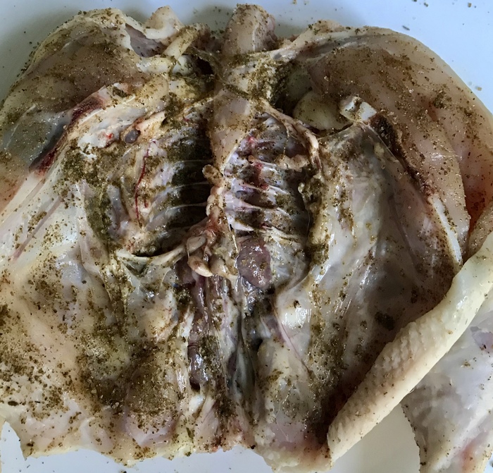2. маринуем сдобрив лимонным соком, солью и перцем. Можно добавить сухого чеснока в порошке - он придаст хороший аромат цыпленку и при этом не сгорит при приготовлении