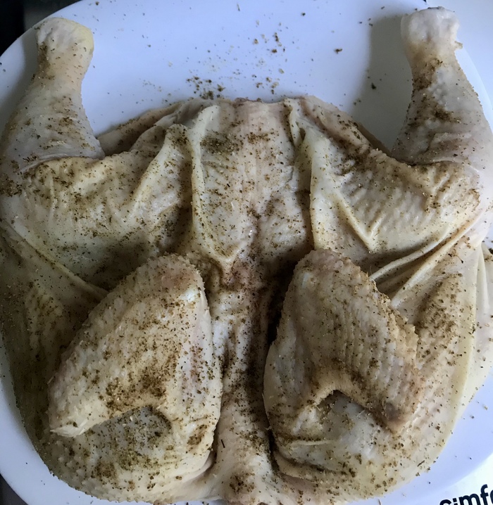 Вчера одному из комментаторов своего предыдущего поста-рецепта, я обещал сделать цыпленка тапака на свой манер. Собственно, рецепт прост, ничего оригинального, учил я его по ютубу, он сразу мне выдал ссылку на некого грузинского повара, которы научил меня делать это блюдо. Скажу сразу, кеци у меня нет, я плохо обращаюсь с глиняной посудой, не умею, горшки - да, их навалом, разные, но вот кеци нет, ее роль сыграет хорошая чугунная сковорода, роль пресса исполнит чугунная сковорода малого размера и чайник полный воды. Ингредиенты.... Я даже не знаю, что тут писать.... Цыпленок одна штука, 1,5 зубчика чеснока, кусочек сливочного масла, и да, королева специй в данном блюде - сванская соль. Именно она делает это блюдо таким своеобразным, солит и одновременно добавляет вкус трав. Поверьте, сванская соль в этом блюде, да и в любом другом, сыграет так, что Вам понравится. Впрочем, среди комментаторов я видел и жутких противников кориандра и кинзы, так что советовать Вам ее купить не буду, думайте сами.