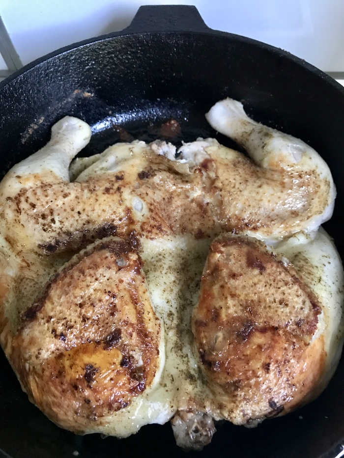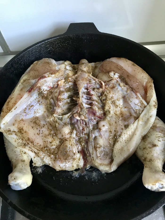 Итак, цыпленка моем, намного опаливаем на газу, ну мало ли перья там остались, разрезаем вдоль грудки, берем кулинарный молоток, перебиваем суставы, что бы от жара цыпленок не восстал:), натираем сванской солью со всех сторон. Осторожно, есть риск пересолить, у меня ушло 2 столовых ложки, но мы любим соленое с женой, чуть на грани пересола. Одновременно нарезаем мелко 1,5 зубчика чеснока, в миску его и кусочек сливочного мала, это потом сыграет в блюде. Достаем сковороду и тут главное, медленно ее нагреть, что бы чугун аккумулировал тепло по всей поверхности, на газу , на небольшом огне у меня ушло минут 15, добавляем потом растительное масло, 2 столовых ложки, больше не надо, поверьте, курица вымерит свой жирок при жарке. Чуть увеличиваем пламя, и кладем тушку цыпленка кожей вниз, сверху груз, убавляем огонь до минимума и 15 минут на одной стороне, потом 15 на другой, потом еще по 5 минут на каждой стороне. Когда почти готов, ставим миску с чесноком и сливочным маслом в микроволновку буквально на минуту, масло тает, размешиваем. Выключаем плиту, в чугуне еще достаточно жару, нам ведь горелый чеснок не нужен? Поливаем маслом с чесноком с двух сторон нашу тушку, растираем, накрываем крышкой минут на 10. Достаем, едим. Сочно, вкусно. То, что на фото (фото идут последовательно), уже съедено мной и женой, на все ушло минут 15, с хлебом, со свежим помидором и огурчиками. В общем, рецепт мой, пробуйте, понравится, я буду рад, нет, ну ладно. Фото для критики прилагаю (сейчас начнется, знаю), руки кривые , горизонт завален, фоткал на огрызок. Приятного аппетита.