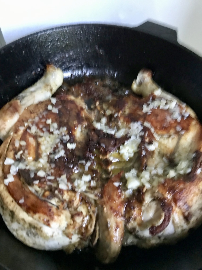 3. готовим на топленом масле либо его можно заменить смесью сливочного и подсолнечного на чугунной сковороде с прессом (тапе). За неимением специального пресса цыпленка можно прижать во время запекания, поставив на него например кастрюлю с водой