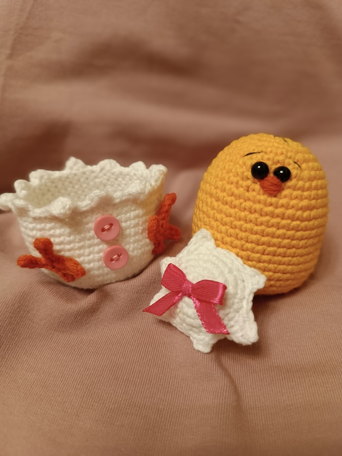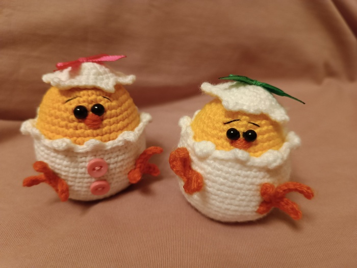 Цыплёнок побольше: пряжа YarnArtJeans (45% акрил, 55% хлопок). Цыплёнок поменьше: пряжа Пехорка "Детская новинка" (100% акрил). Крючок №3. Пуговицы, атласная лента, глазки на безопасном креплении и бусины. Время работы: около 3 часов.