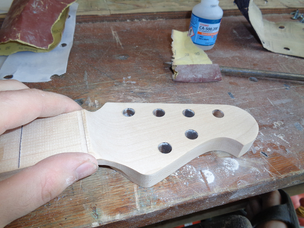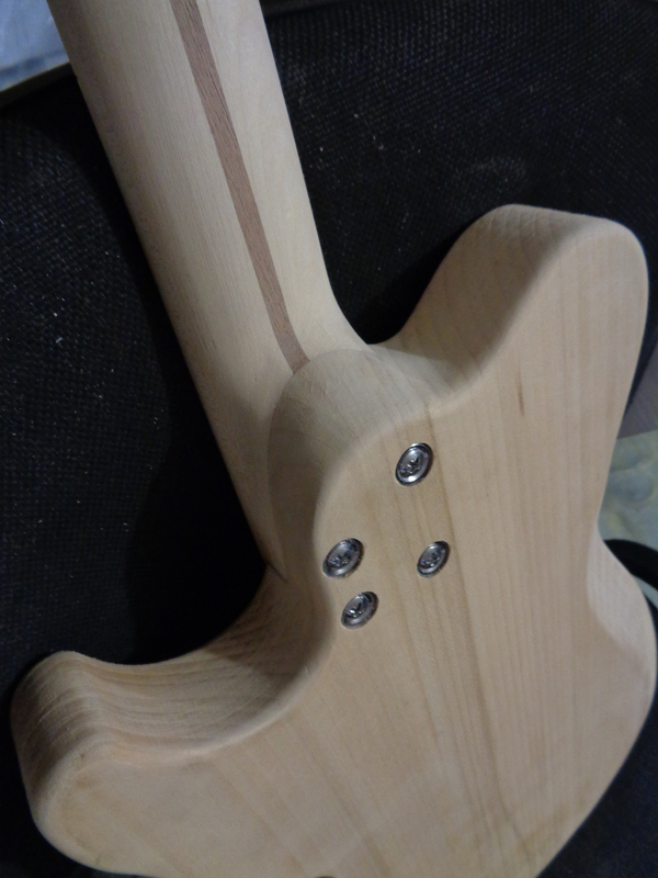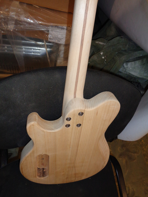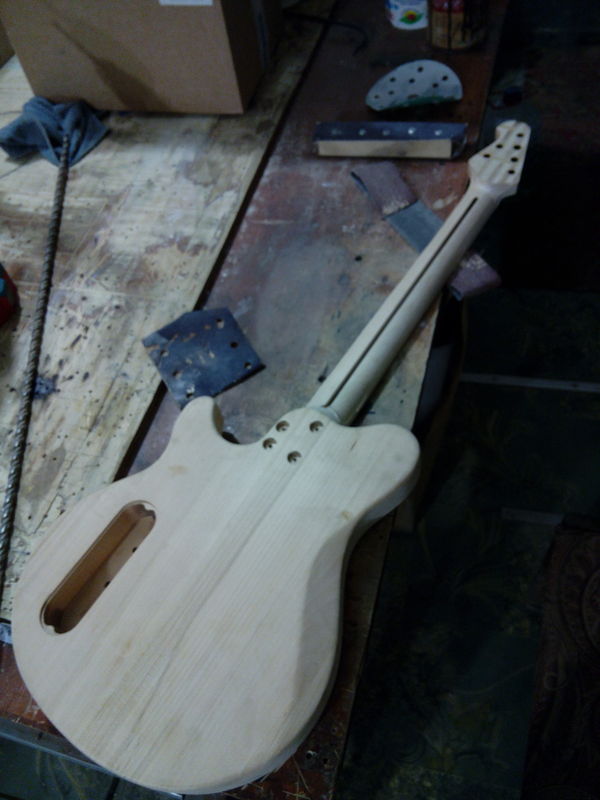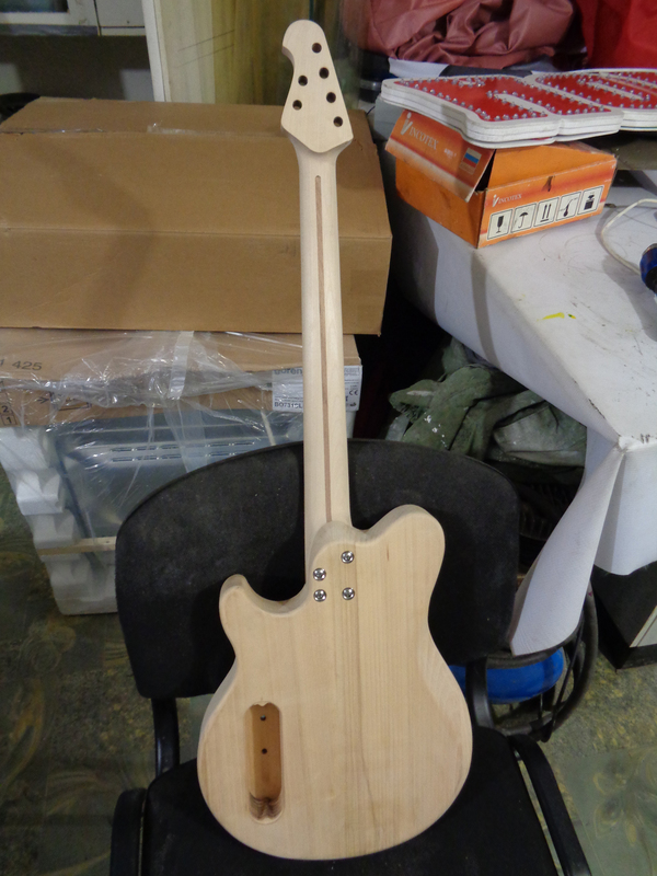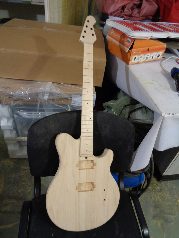 После приклейки накладки к заготовке грифа следует примерка получившегося грифа к корпусу. Уже что-то похожее на гитару:
