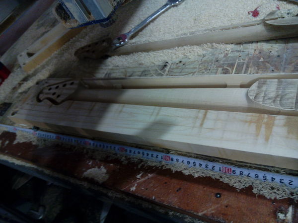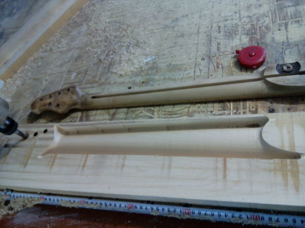 Выведя профиль грифа по-старинке вручную (на ЧПУ пока побоялся) приклеил гриф к корпусу. Профиль грифа - ассиметричный, осевой линией, удалось сделать довольно тонким на первом ладу за счет отсутствия паза под регулировку анкера. После вклейки грифа меня ожидала очередная головоломка: нужно было сделать красивый переход от грифа в корпус. На помощь пришла верная стамеска и цикля, вот что получилось: