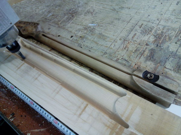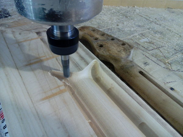 Получившаяся заготовка грифа вместе с заготовкой накладки отправляются на ЧПУ, где будут выполнены пазы для анкера и карбоновых реек, выпилена форма грифа, накладке будет придан мультирадиус 10-16 дюймов и выпилены пазы под лады и инкрустацию. Заценить можно на таймлапсах: