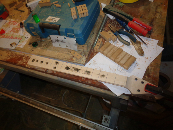 Первая головоломка поджидала меня на этапе проектирования и была связана с необходимостью совместить тремоло и мультимензуру. С этим вопросом я вышел в интернет (с). Потратив довольно продолжительное время на изучения доступных тремоло систем, я пришел к трем вариантам: 1-й вариант - взять тремоло от безголовых гитар с наклонными индивидуальными бриджами, и использовать имеющиеся там узлы настройки как микроподстройку, хотя их передаточное соотношение совсем не подходит для этого, да и цена таких систем подходящего качества весьма высокая. 2-й вариант - использовать специализированное тремоло фирмы Kahler, предназначенное специально для гитар с мультимензурой. Однако цена его оказалось космическая, более 600 бакинских, плюс пошлина, поэтому этот вариант так же был отвергнут. 3-й вариант заключался в использовании стандартного тремоло с использованием его как точки отсчета при расчете мензуры. При этом получается, первый лад довольно сильно наклоняется, так что при выборе мензуры первой и последней струны сильно не разгуляешься. В итоге остановился на величине мензур 25.5 - 26.5 для первой и 7-й струн соответственно.