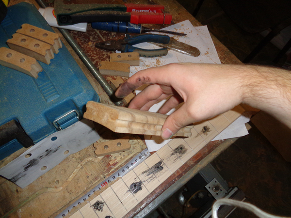 Перед приклейкой накладки необходимо задать угол наклона пера грифа. Здесь пришлось основательно поломать голову, попробую объяснить почему. На гитарах без мультимензуры для задания угла пера можно просто отпилить его перпендикулярно заготовке, перевернуть отпиленный кусок и приклеить его, получив нужный угол. Так можно поступить и нашем случае, но при этом за порожек будет выступать оставшаяся треугольная часть накладки,прикрывающая анкер. Так делают, например, Ibanez, по-видимому чтобы не перестраивать производство. Я же решил сделать "кросивое", дополнительно закрутив перо вокруг продольной оси грифа, в итоге пришлось делать несколько распилов, чтобы получить пространственный угол установки пера и напрячь мозги тригонометрическими преобразованиями чтобы этот самый угол вычислить. Также для красоты приклеил на перо накладку из ореха, чтобы совпадала с топом. Вот что получилось: