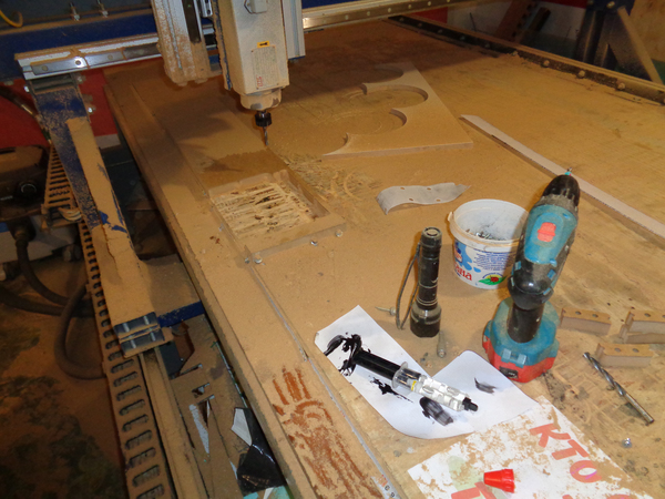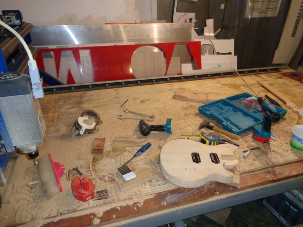 Далее этот "бутерброд" отправляется на мой самодельный ЧПУ, где по построенной мной заранее 3D модели будут выпилены все хитрые формы будущей гитары. Ход выпиливания корпуса гитары можно заценить на снятых в процессе таймлапсах: