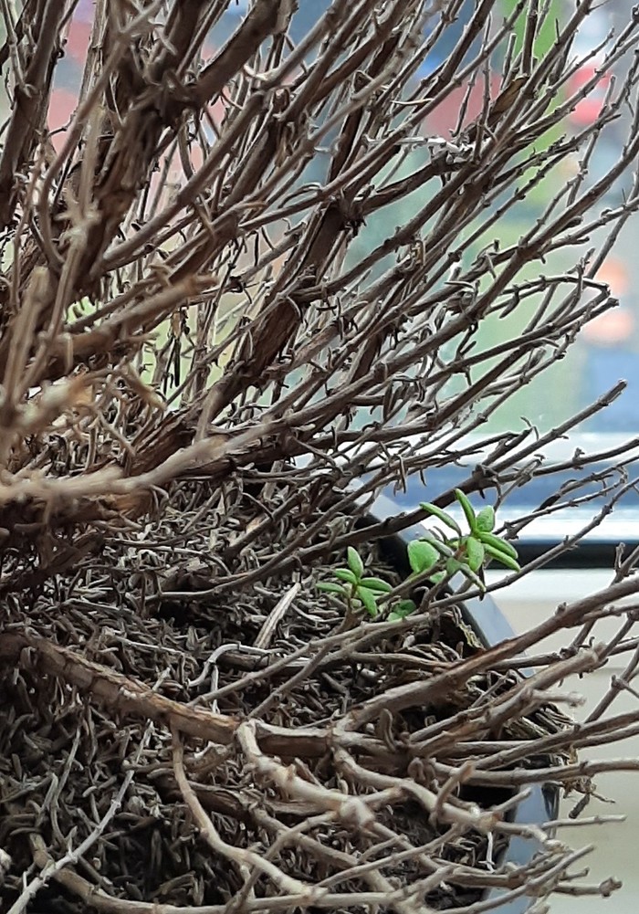 Одна веточка пустила листву! Так что желудь отправится в другой горшок, а за чабрецом буду наблюдать.
