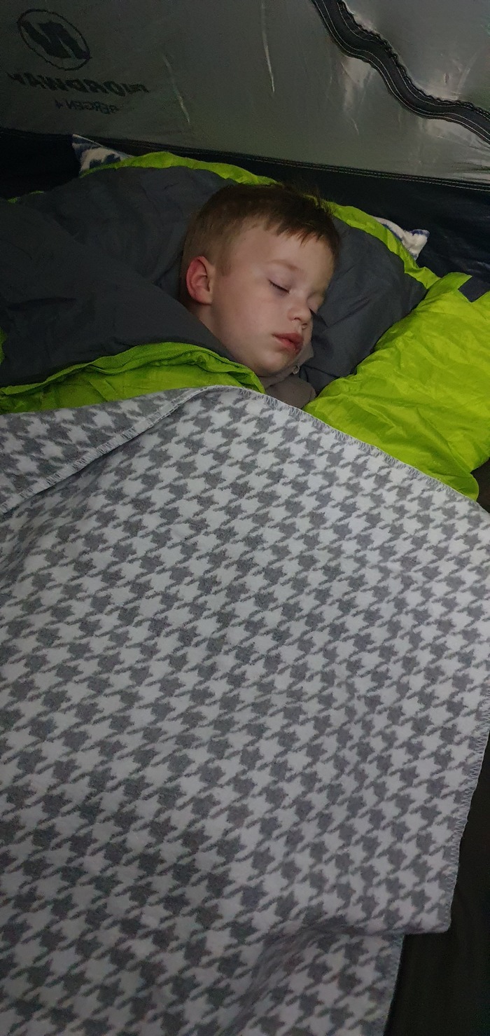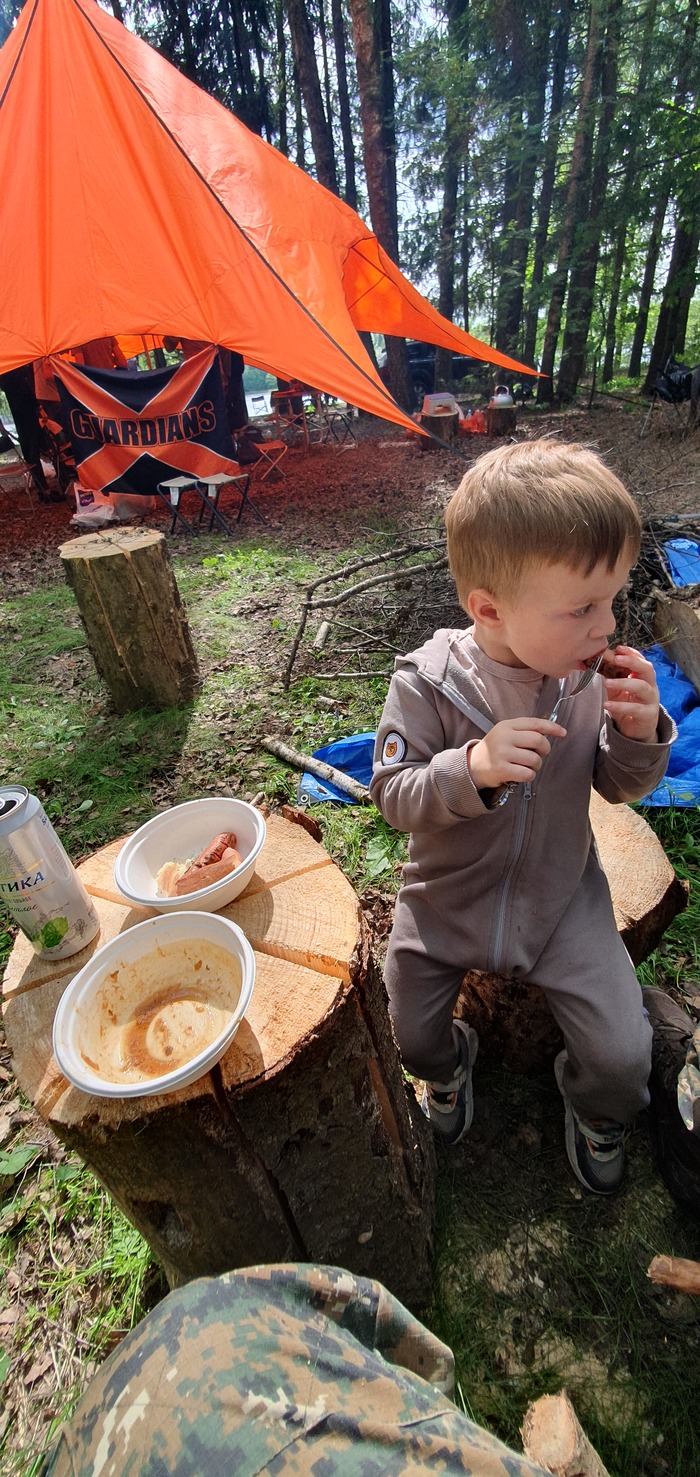 Возвращаемся с наследником из его первого похода с ночёвкой в палатке.
