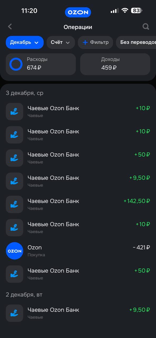 Теперь о самих чаевых. Получать их может сотрудник работающий под своей учеткой в пвз и подключенный к озон чеку. Только так! Если жадный хозяин не создал сотрудникам учетку все сидят под его, весь чай упадет ему. Комиссию сам озон с чаевых не берет. Если чаевые перечисляются с озон карты то комиссии нет, если со стороннего банка, то есть небольшая за перевод. Ниже скрин с моего озон банка. Как видите, не озолотилась я с чаевых, но безумна благодарна каждому человеку который их переводил. Очень приятно, что я где то помогла и оставила хорошее впечатление от посещения нашего пвз.