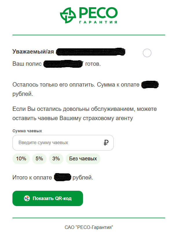 Доброго дня всем. Чаевые добрались и до страховых компаний. Ситуевина обычная - ипотека застрахована. Пришло сообщение от менеджера со ссылкой на оплату. Перешел и увидел окошко с чаевыми. Забавно...