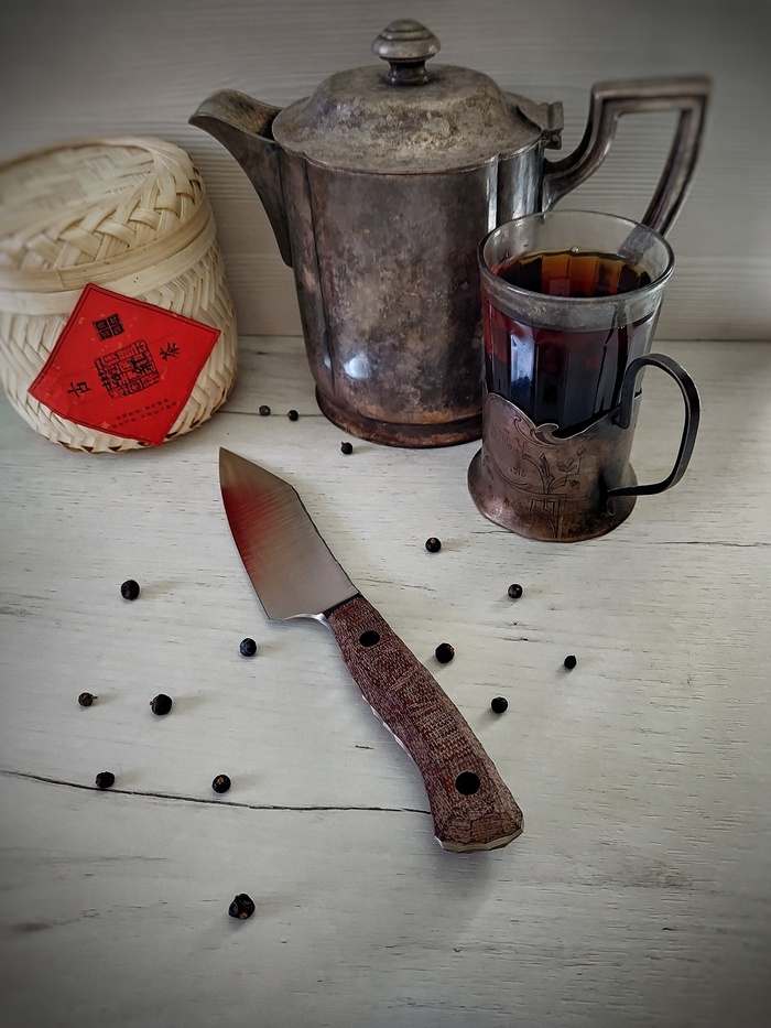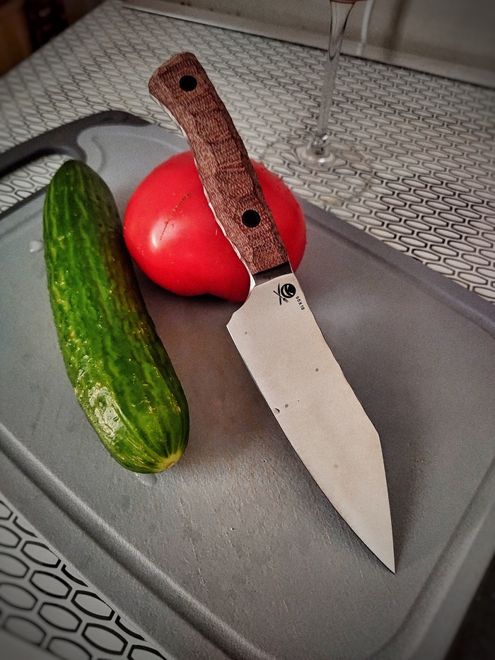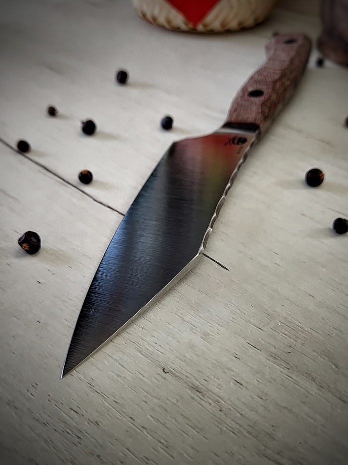 Итак: 95Х18, 56-57 роквеллов, текстолит, карбон. Общая 245мм, клин 135х37х4мм, сведение под заточку 0,15, режет, как... Ну, злобно. Аж порезался, пока испытывал)))