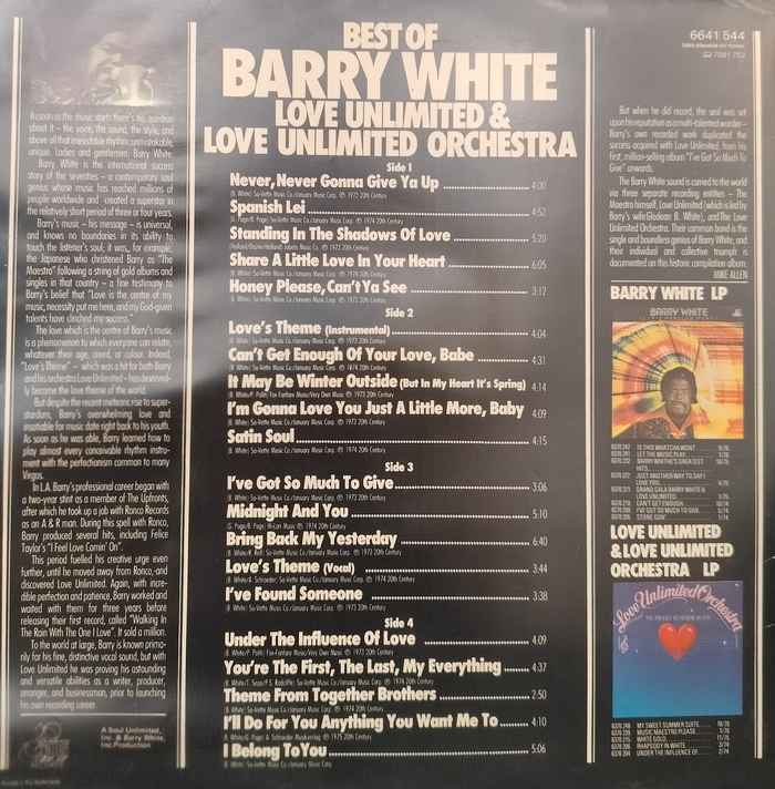Пойдем от простого к сложному. Надо разобрать название диска, уж очень оно большое))) и так на русский это можно перевести как «Лучшее Бари Уайта, неограниченная любовь и оркестр неограниченной любви», ну как то так, если есть переводчики переведите лучше, мне помог автоматический.