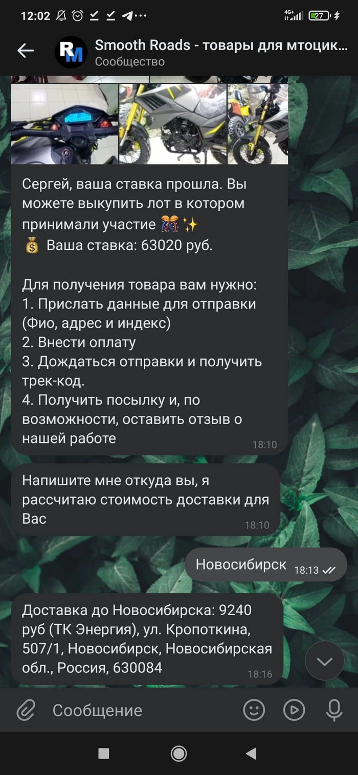 В группе проходил аукцион с несколькими мотоциклами. Решил поучаствовать, выбрал интересующий меня мотоцикл, написал в сообщения сообщества. Написали что я победил в аукционе.