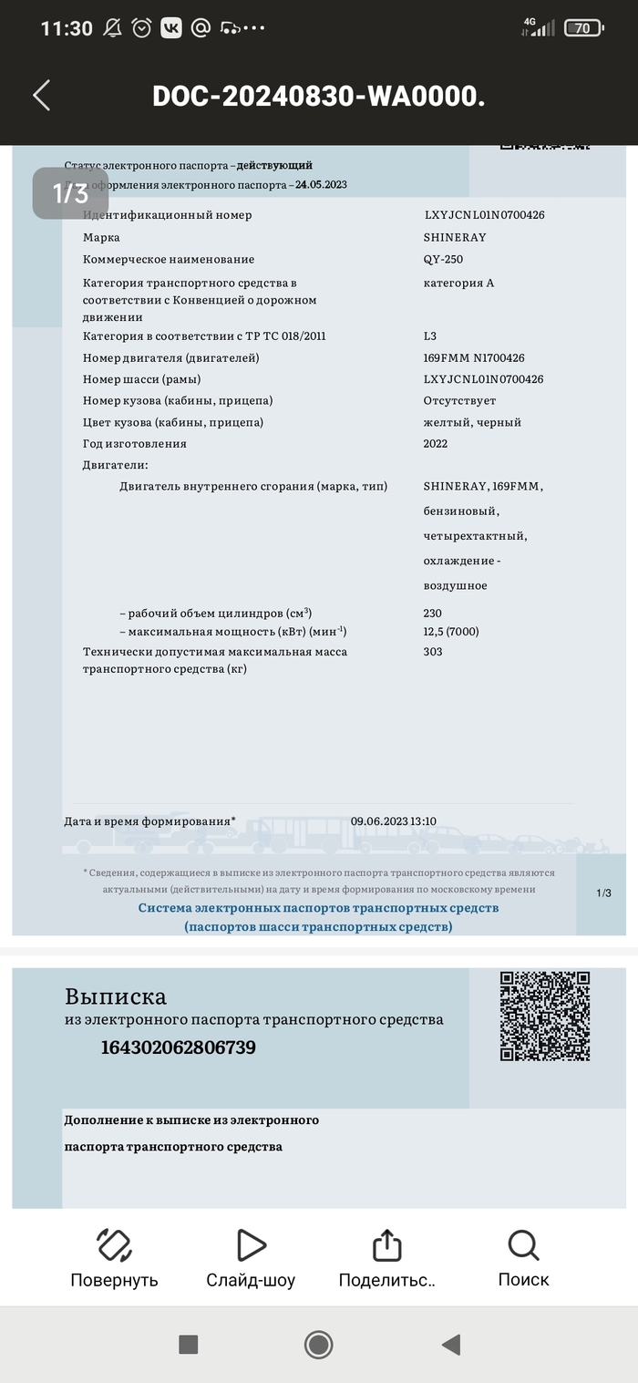 Нашел их контакты, связался с отделом продаж, выяснилось, что мотоцикл Shineray Mirage 250 с номером рамы LXYJCNL01N0700426 и номером двигателя 169FMM N1700426, указанными в выписке из ЭПТС,