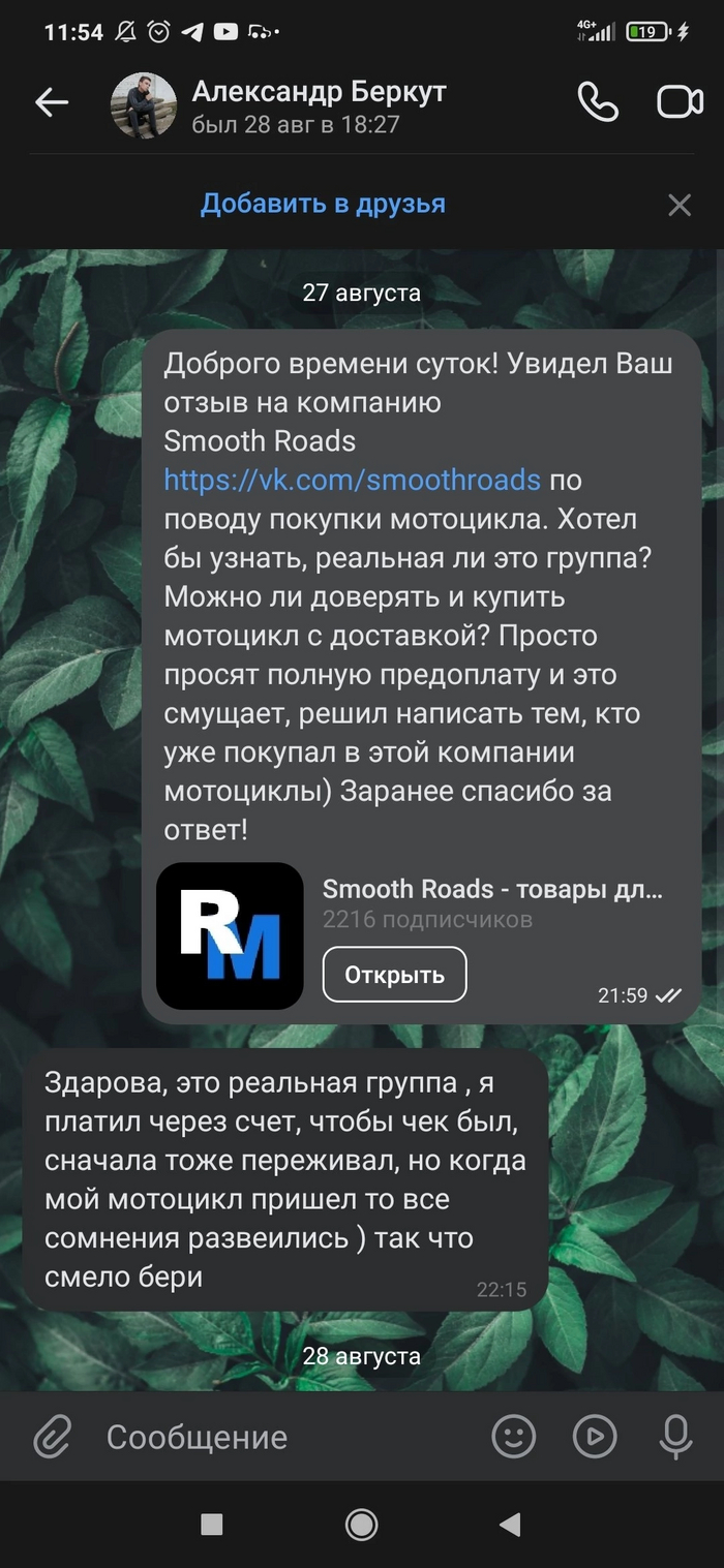 Группа попалась мне в рекламе в новостной ленте. Посмотрел, что группа существует с 2022г, имеет 2,3тысячи подписчиков, регулярно выкладываются записи о поступлении новых мотоциклов, видео с отправкой мотоциклов, есть много положительных отзывов.