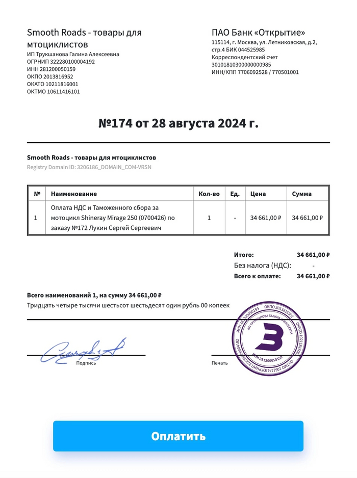 Итак, мне скинули ссылку на оплату на платформе vkpayeronline, я проверил все реквизиты, такой ИП действительно существует. Вот все номера и сведения: