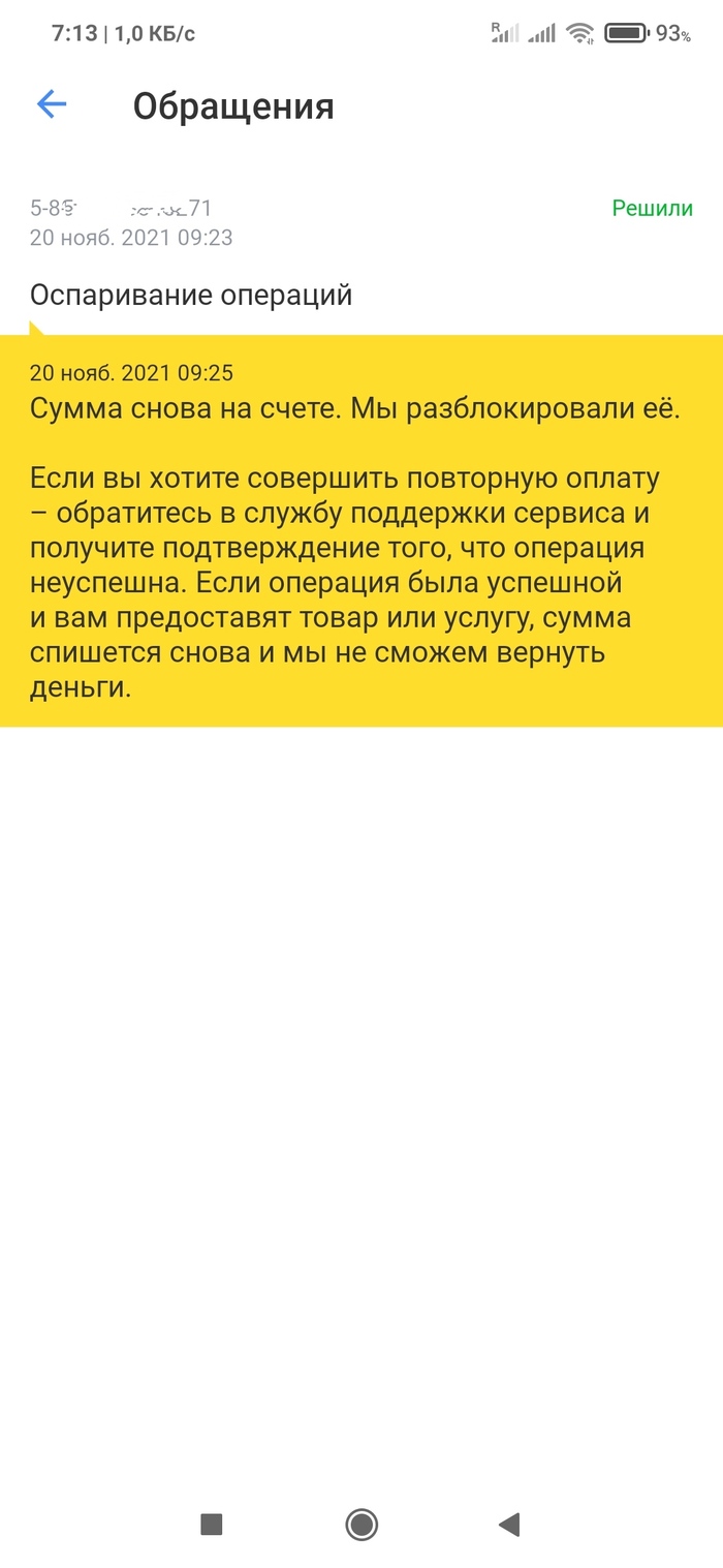 29.10.21 Я обратилась в Тинькофф банк, описала ситуацию с магазином и спросила, не может ли банк временно заморозить операцию, пока мы не выясним с магазином, что же произошло, почему возврат не отметился в системе. В Тинькофф сразу оформили моё обращение как "оспаривание операции". Несколько раз в банке откладывали решение вопроса - переносили дату, ждали возврата денег в течение 10 дней. Это длилось в течение двух недель. Магазин сказал ожидать рассмотрения и на связь не вышел, 10 дней на возврат денег истекли.