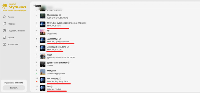 Всем привет, у меня музыкальное образование, я играю на 4 инструментах, и в качестве хобби иногда пишу песни, и тут решила зайти на «главный музыкальный чарт» страны, и это Яндекс, может быть он не главный, но на слуху точно. Решила посмотреть, что слушают уши в нашей стране, то есть мы с вами. И что в топе.