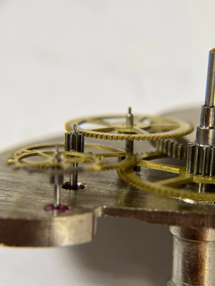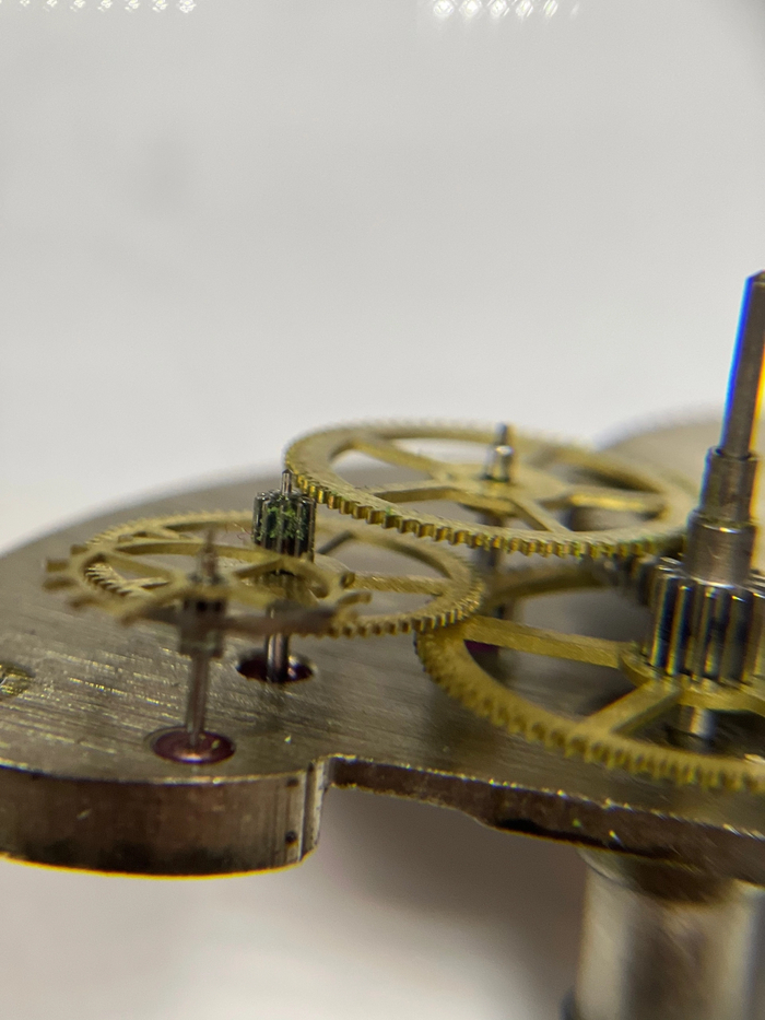 Внимание на колесе на переднем плане - анкерное, ось и триб которого в следах старой смазки