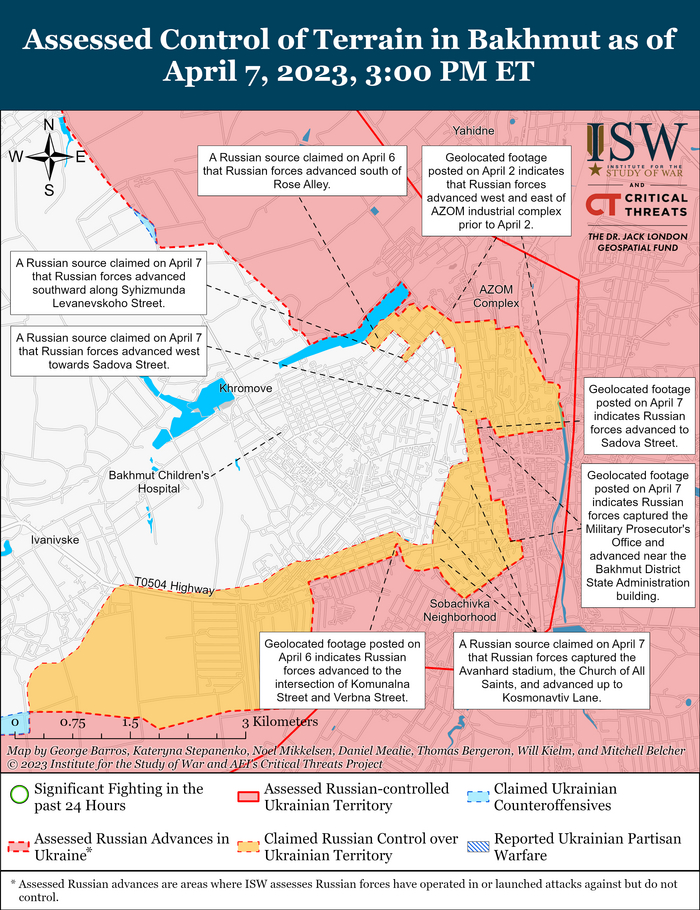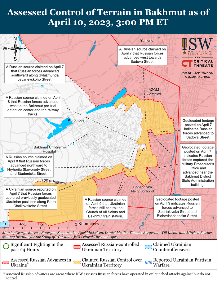 9 и 10 апреля российские силы продолжали завоевывать территории в Бахмуте и его окрестностях, но, вероятно, продолжают нести значительные потери. На кадрах с геолокацией, опубликованных 9 и 10 апреля, видно, что российские войска незначительно продвигались к северо-западу от Хромово (2 км к западу от Бахмута), к юго-западу от Бахмута и к северу от Сакко-и-Ванцетти (15 км к северу от Бахмута).[29]