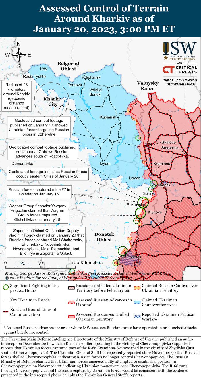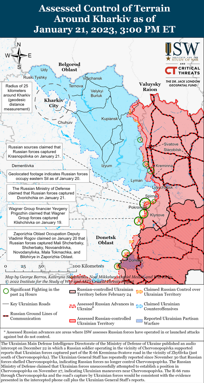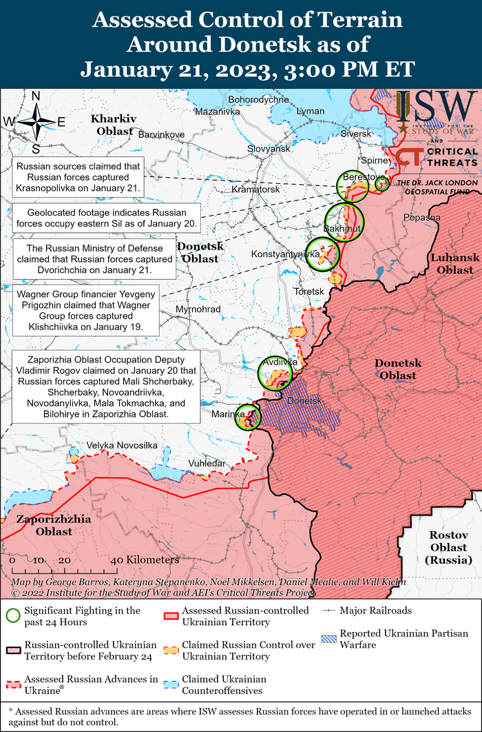 Российские источники продолжают ложно утверждать, что российские силы перекрывают украинские наземные пути сообщения (GLOC) в Бахмут по состоянию на 24 января. Глава ДНР Денис Пушилин заявил, что украинские силы контролируют только одну дорогу в Бахмут после захвата Россией Клищевки, что дало российским силам оперативный контроль над большинством ГЛОК в районе Бахмута.[33]
