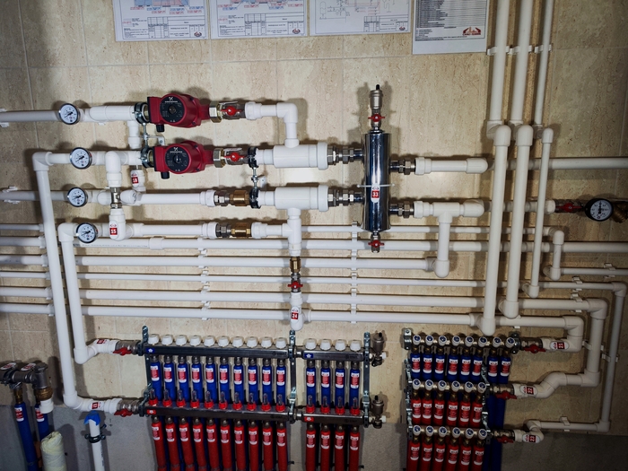 Теплые полы под плиткой во всем доме, как основная и единственная система отопления всё больше завоёвывает популярность. И не только в небольших одноэтажных строениях, но и в достаточно больших, - с двумя, а то и тремя этажами, - данный дом тому очередное подтверждение. Ну а вашему вниманию представлена котельная для коттеджа с такой системой.