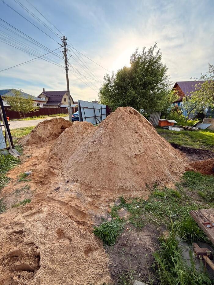 Привезли песка. Вроде водитель говорил про 20 кубов. Я сомневаюсь. Засыпал полы, пролил, провибрировал плитой, заложил сетку, поставил её на стульчики и залил бетоном. Ушло вроде 4 куба. Получилось не супер ровно, жаль, ну ок.