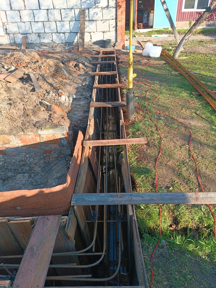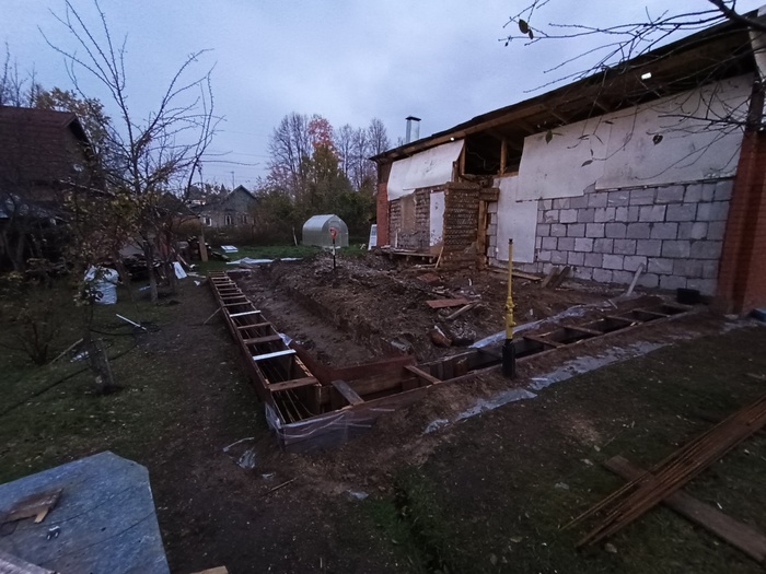 Так же, с другой стороны дома, появилась идея сделать ещё небольшую пристройку 3*4 для того чтобы организовать прихожую. Залил ленту параллельно с полами в основном строении, выложил цоколь.