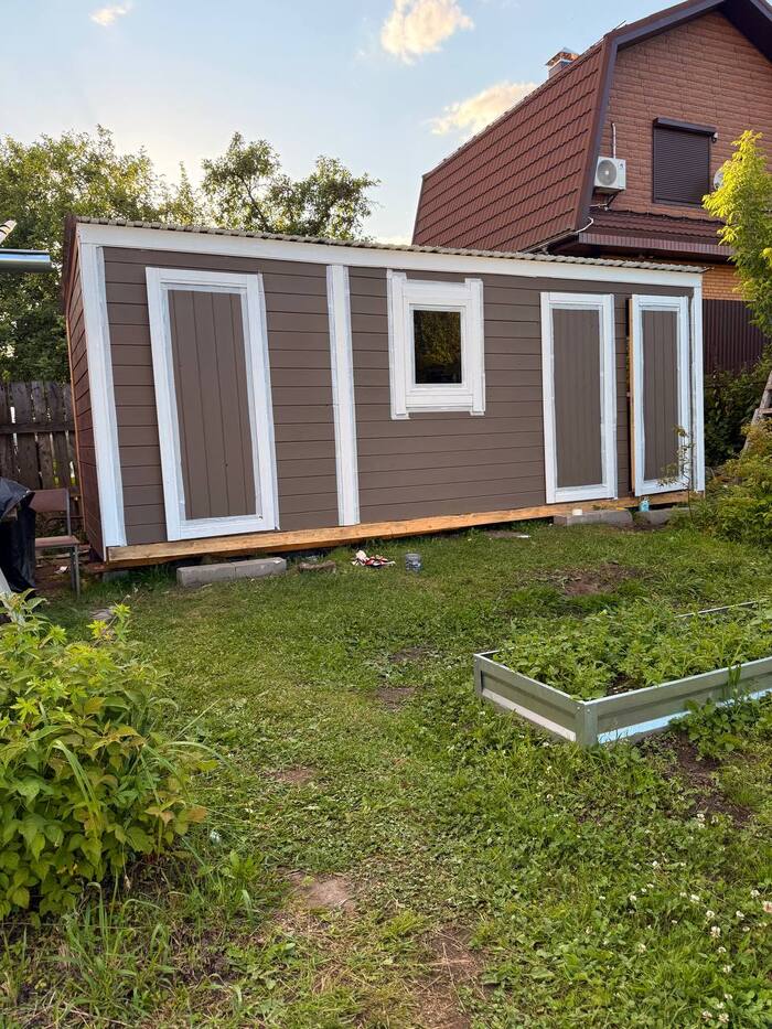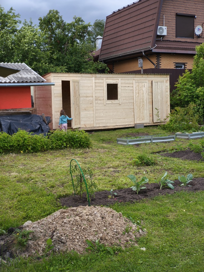 Кстати, знал что будем разбирать старую крышу у кирпичной пристройки и сухого помещения больше не будет, заказал бытовку под ключ. 6 * 2.2. с тремя секциями. Основная часть, где переодеться и поесть, секция под садовый инвентарь, и секция на санузел.