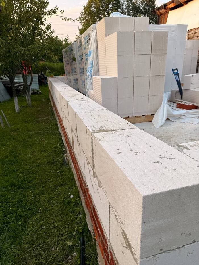 Заармировали первый ряд, да и ряд под окнами, над окнами и предпоследний. Секлоплатиковым прутком арматуры. Очень понравилось с ней работать, прочная и прямая, лёгкая и удобна в доставке.
