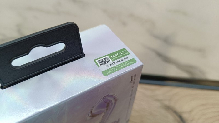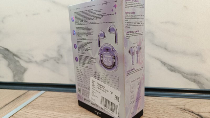 Бокс глянцевый и это пожалуй самый большой минус в этих наушниках. Он довольно быстро марается и довольно скользкий. Крышка упругая и одной рукой не всегда получается ее открыть. Капсула бокса очень компактная и будет почти незаметна в кармане штанов или сумочки. На нижней части присутствует разъем для подключения провода питания.
