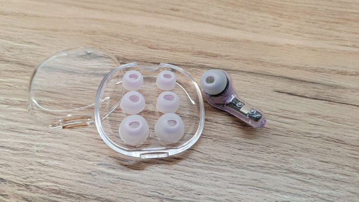 Капсула динамика довольно объемная. Внутри действительно размещается динамик на 13 мм и аккумулятор с платой управления заряда. Это можно будет увидеть чуть ниже. Присутствует пару компенсационных отверстий прикрытых пластиковой сеткой. Сам звуковод овальной формы 3,5*4,5 мм и длиной чуть более 2 мм. Прикрыт пластиковой сеткой. На наушниках установлены резиновые амбушюры среднего размера и жесткости. При длительном использовании не доставляют дискомфорта.