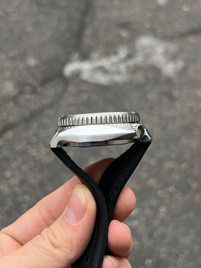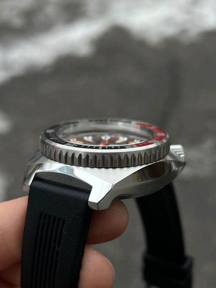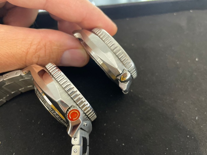 Часы могут похвастаться обилием граней, фасок и методов обработки. Лицевая часть сатинированная с переходом в полированные боковые грани. В часах поражает обилие чётких переходов их качество и точность. Задняя крышка часов под стать оригиналу штампованная. Безель гордо возвышается над корпусом, тактильно упругий при поворачивании.