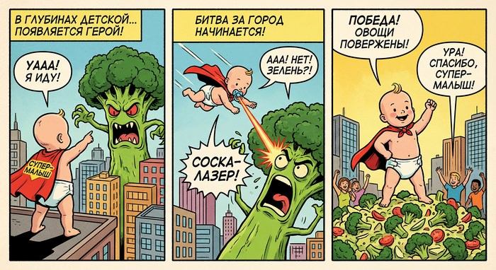 В подобных задачах особенно важны три условия: единый визуальный стиль, узнаваемые герои и возможность размещать надписи. Всем этим критериям отлично соответствует Nano Banana Pro (разработка Google) — нейросеть для создания иллюстраций, способная анализировать сюжет и запоминать внешность персонажей по образцам.
