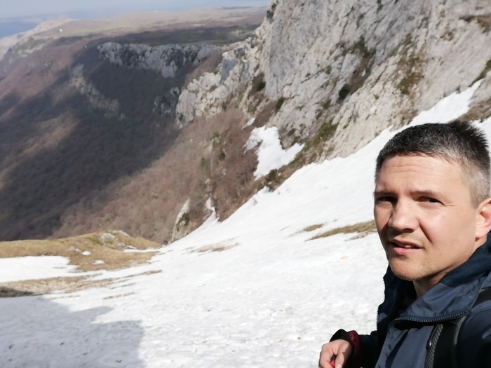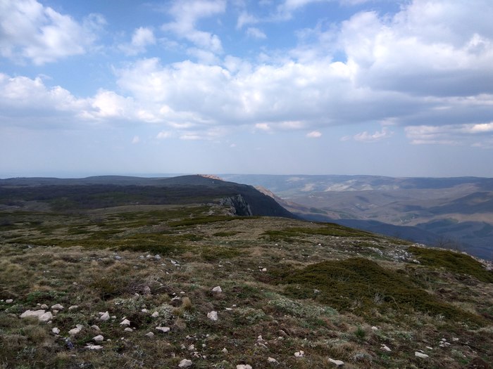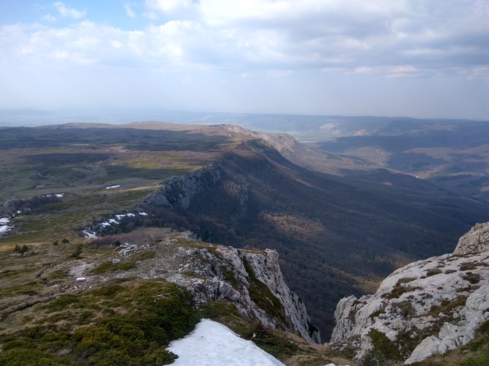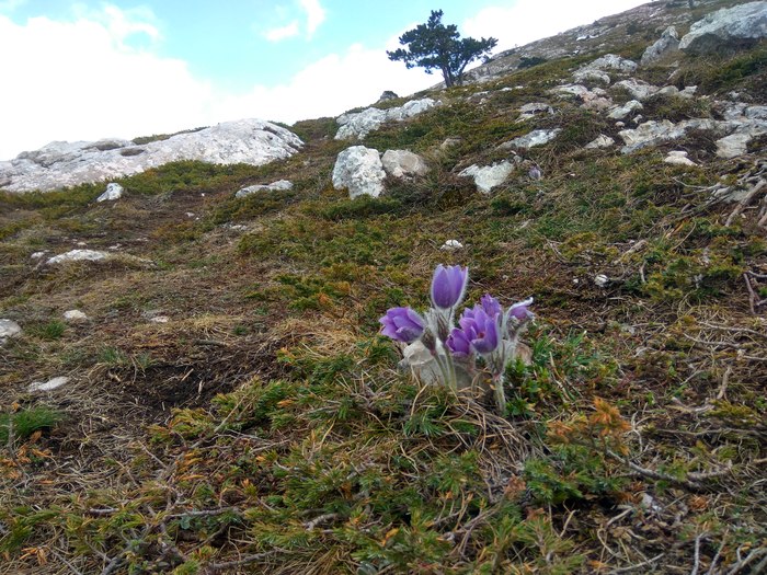 Здесь я двигался медленно, азарт схлынул, спесь с меня сбили горы, поэтому оставалось глазеть по сторонам, наслаждаясь пейзажем. Я ступал по тропе, что проложили по самому краю, но здесь это не было опасно. Край плато слегка изгибался и вскоре глядя назад я мог видеть вертикальную стену, возвышающуюся над лесом, по которой я только что прошел. На нижнем Чатыр-Даге еще много где лежал снег, виднелись распадки известняковых пород, темные клочки островов кривых хвойных деревьев. Уклон тем временем усилился и тут-то вот я почувствовал, как на самом деле вымотался. Адреналин от Кулуара закончился и я еле полз вверх, задыхался, как от горной болезни, вообще-то я так себя и чувствовал, как при горняжке, но был слишком низко примерно на 1350м. Я шел, хотя хотелось сесть и разглядывать множество волосатых фиолетовых цветочков, растущих тут. Я выбирал ориентир и шел до него отказывая себе в отдыхе, а в голове вновь нарастало беспокойство: "Я уже ушатался, а ведь еще назад идти"