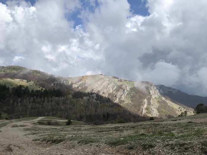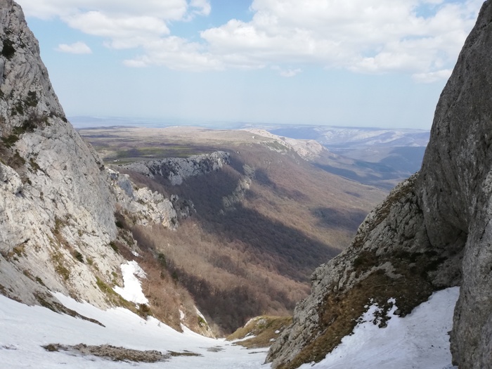 Я тоже пошел вверх. Подъем был резким, но проложен серпентином. Наверху задувал ветер, я оделся и тут у меня сел телефон. Ха! Но у меня есть полностью заряженный второй. Я переставил симку, загрузил МапсМи, который выдал мне "Загрузите карту Крыма". Инета нет. Аааааыы! Это было подло. Мраморной пещеры мне не видать. К этому времени подгрузились тучки и стало ощутимо прохладнее. Но не идти же вниз. Чтобы не возвращаться, ну, совсем уж ни с чем, мне нужна хоть какая-нибудь победа. Я пошел по нижнему плато к верхнему намереваясь дойти до вершины и поглядеть на поимевший меня кулуар сверху.
