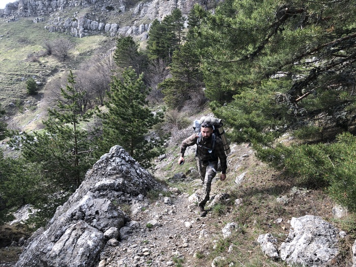 Проснулся под щебет птичек, встал, умыл щщи в ручье, раздул с углей костер для уюта и стал варить макароны на горелке, на завтрак. Проснулись инструктора и разбежались на пробежку. Ну, и ЗОЖ с ними. Пока я улепетывал тазик макарошек с мазиком и колбасой, спортсменши начали варить кашу. А я пристал к Глотову, куда еще сгонять, тот поглядел в карту и сказал, а не пойти бы тебе Леха на Чатыр-Даг и в Мраморную пещеру. Далеко послал, видать надоел я им. На гору Чатыр-Даг идти я не хотел, потому что был там однажды на обеих вершинах, да и горой назвать можно только глядя снизу, а вообще Чатыр-Даг это верхнее плато и нижнее. Я был на верхнем, а Мраморная пещера на нижнем. На том я и порешил. В этот раз я оставил палатку и рюкзак, экипировавшись легким радиальным рюкзачком, водой, флиской и трекинговыми палками со стремными розовыми кольцами для ходьбы по снегу. Может снять? А нафиг, лень. МапсМи проложил маршрут и я почесал упругой походкой в лес.