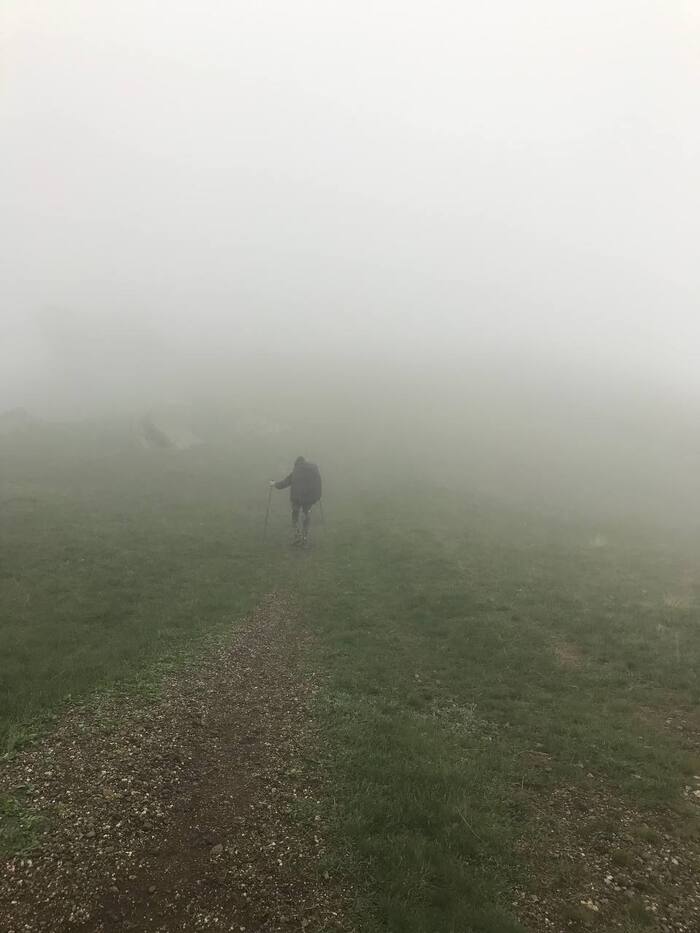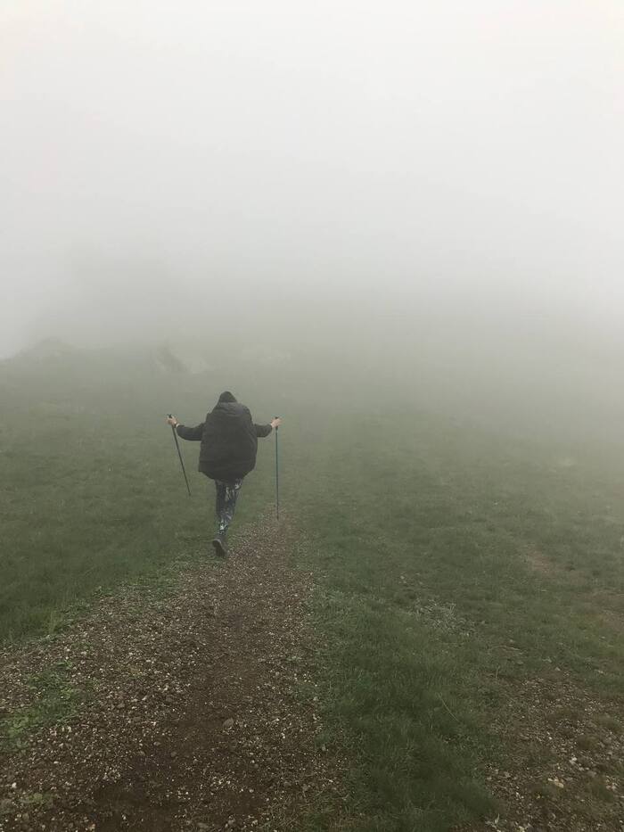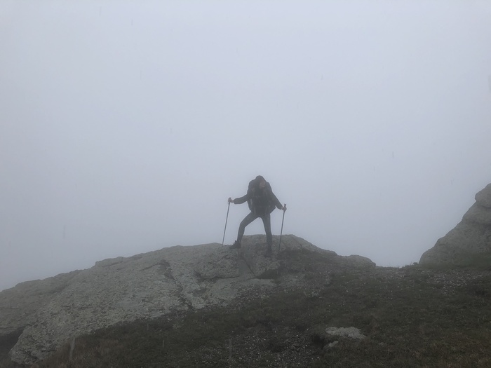 Только мы успели пробудиться и собрать палатку, как начался дождь. Только разогрели чай – начался град. Только вышли на маршрут в долину Привидений, как нам несказанно повезло – опустились тяжёлые дождевые облака, вершины окутал густой туман, который быстро падал со склонов.