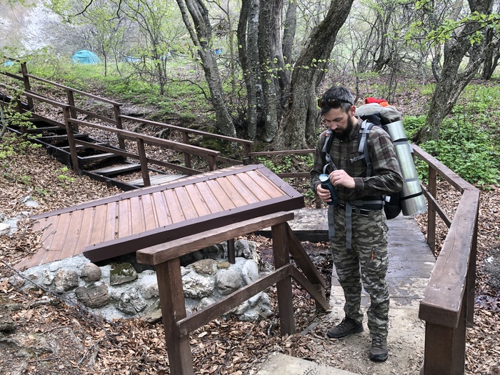 По Красной тропе мы поднялись к источнику Туз-Чешме (44°47'54"N 34°18'33"E), который уже успел превратиться в болотце - на него можно полагаться только во время таяния снега. Далее собирались на Спелеобазу "Оникс", попробовать оставить там рюкзаки, чтобы пройтись по пещерам и после спуститься по Тисовому ущелью к месту для стоянки "Ангарский перевал".