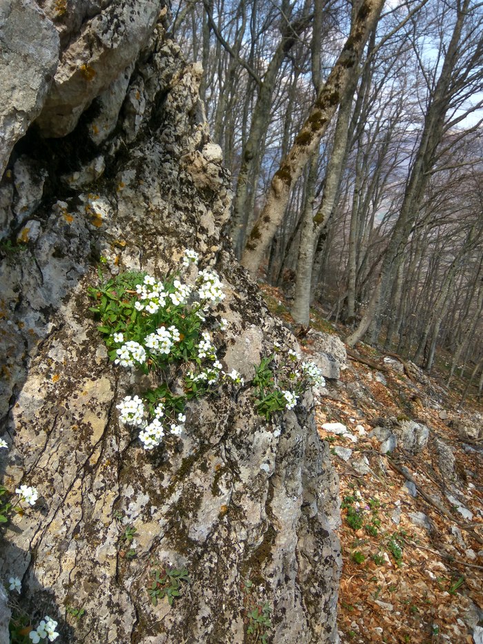 Так было пока я шел по тропе, но через некоторое время мне стало скучно и я увидел какую-то вершину. У меня появилось почти что сексуальное желание упороться об гору, поэтому я свернул с тропы и ломанул в лоб. Я хрипло дышал ломясь сквозь появившиеся кусты, прыгая через поваленые стволы и карабкаясь вверх по скалам, тем временем тисы и грабы уступили место дубовой роще с редкими цветущими яблонями. Мышцы требовали работы, под подошвами каменная крошка, на небе ни облачка и солнце. И вот хват, зацеп и еще, подтянулся, вышел силой и последняя скала позади, палки болтаются на одной руке еще несколько прыжков и да! Я на вершине! У подножия раскинулся лес, а лагерь отсюда казался до смешного близким. Конечно эта вершина уступала Чатыр-Дагу и стоящему напротив Димерджи, но я ее одолел. Открыв, навигатор я узнал, что это Сахарная Головка. Мда. Покоритель Сахарной Головки. Наверное ее назвали так за выход известняковых пород на вершине, где ничего не росло.