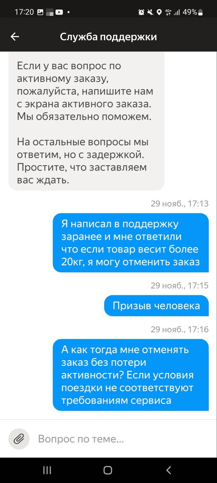 Работаю через приложение Яндекс Про. Пользователь заказал услугу экспресс и зачем-то указал в комментарии "от двери до двери", когда для этого есть специальная кнопка и данная услуга оплачивается. Приехал по адресу забрать посылку. И к моему удивлению, в мою машину хотели загрузить 140кг. А в услуге экспресс ограничение груза до 20кг.