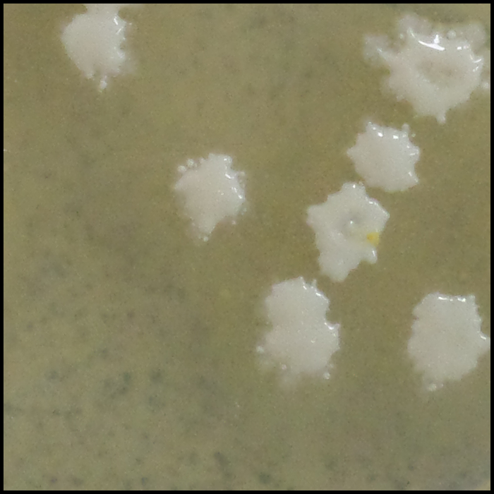 Среда ЖСА (желточно-солевой агар). Вокруг колоний можно заметить "радужный венчик" - признак наличия у колоний лецитианзы, фермента, разрушающего лецитин. Это характерный признак золотистого стафилококка.